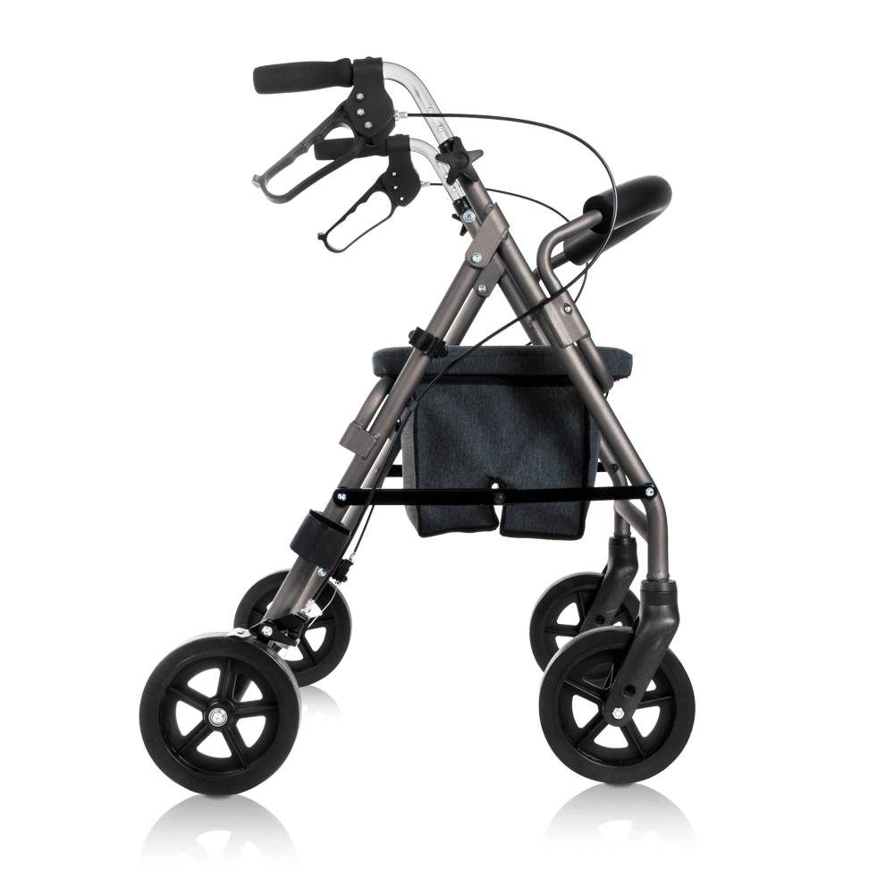 El 4200 XL es un andador diseñado para mayor resistencia y durabilidad, fabricado en aluminio ligero y resistente. Cuenta con freno de maneta y un cómodo asiento de 35 cm de ancho y 34 cm de profundidad, además de un soporte para bastón incluido. Tiene una capacidad máxima de carga de 138 kg y presenta un diseño renovado en un elegante color gris mate, con tejidos de alta calidad en el asiento y la cesta para mejorar su aspecto y comodidad.