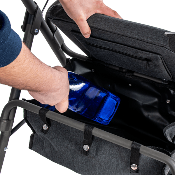 El andador 4200 XL ofrece un asiento amplio y acolchado de 35 cm de ancho y 34 cm de profundidad, con un espacio útil para sentarse de 45 cm. Además, cuenta con una práctica bolsa integrada para guardar pequeños objetos o documentos.